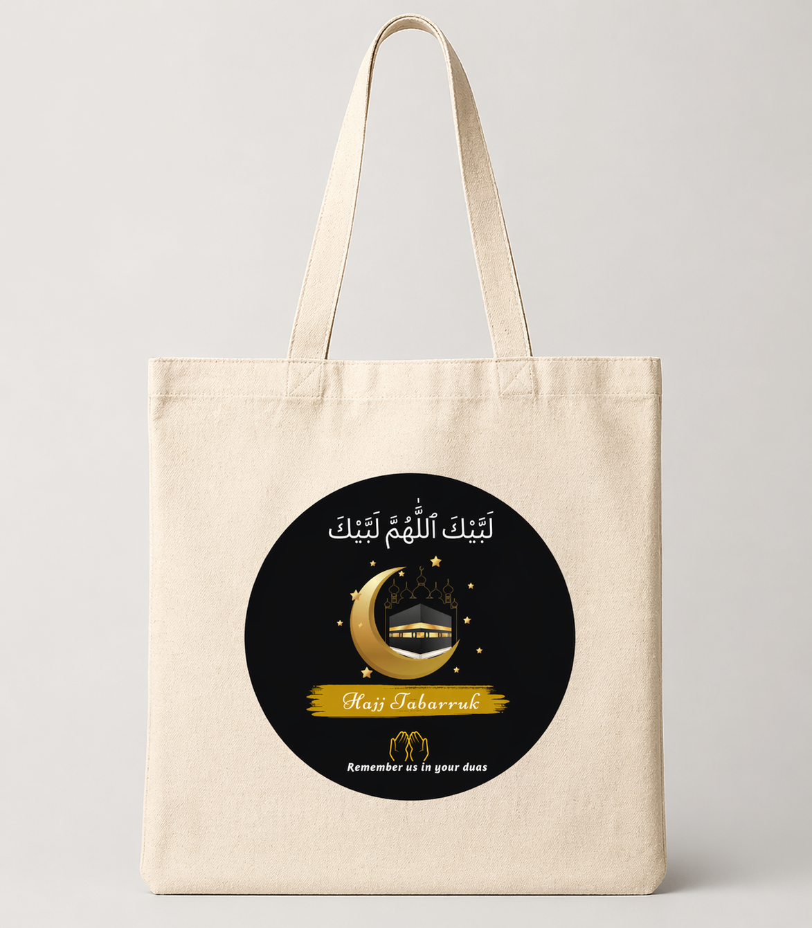A thoughtfully designed Hajj Tabarruk canvas tote bag, perfect for carrying blessings with elegance. Featuring a beautiful Islamic design, this bag is ideal for Umrah return gifts, gifting hampers, and everyday use.